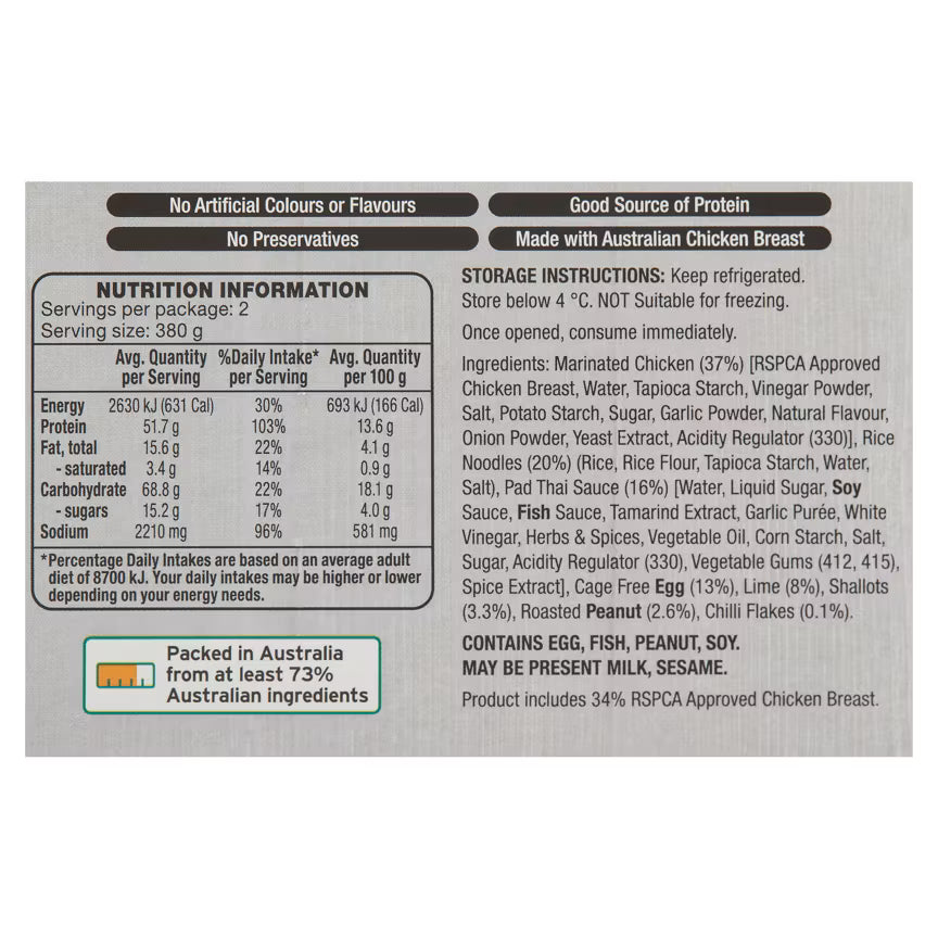 Chicken Pad Thai Kit is made with marinated RSPCA Approved Chicken Breast, with no artificial colours, flavours, or preservatives. It includes rice noodles, a rich Pad Thai sauce made from authentic ingredients, and garnishes like lime and roasted peanuts. It's packed in Australia for quality and taste.